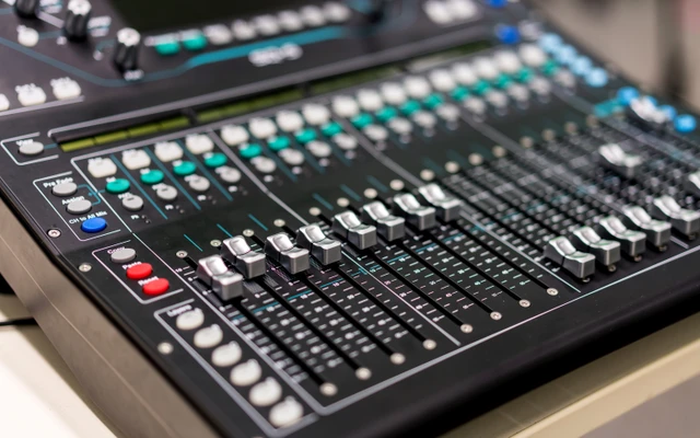 Digitální zvukový mixpult Allen Heath SQ5 pro řízení mikrofonů a linkových vstupů pro stream.
