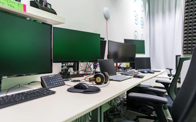 Výkonný počítač (Windows 11), odbavovací a streamovací software vMix, Microsoft Office, monitory 27“/ 22“ pro snadné odbavení, patchovatelné video cesty monitorů, odkuků a streamování.